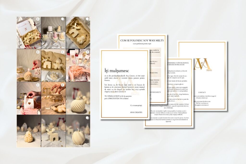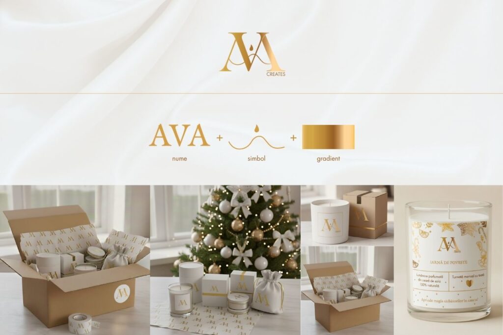 Pentru Ava Creates, am construit identitatea de brand de la zero, pornind de la viziunea Valentinei, creatoarea brandului, și de la valorile care definesc universul Ava. Ne-am ocupat de realizarea logoului și a identității vizuale, precum și de grafica pentru materialele de brand: thank you cards, instrucțiuni de utilizare, stickere și etichete pentru lumânările din colecția de iarnă. În completarea identității vizuale, am realizat fotografii și videoclipuri de produs și ne-am ocupat de strategia și conținutul de social media pentru lansarea brandului și campania de Crăciun.